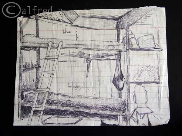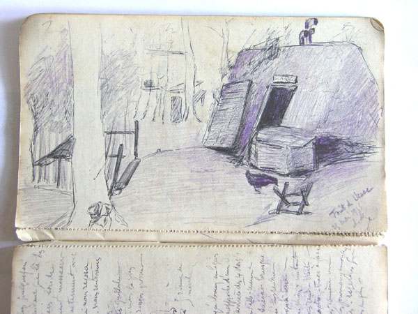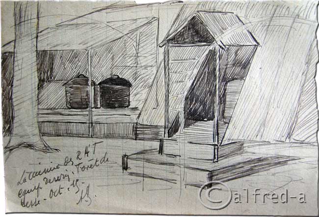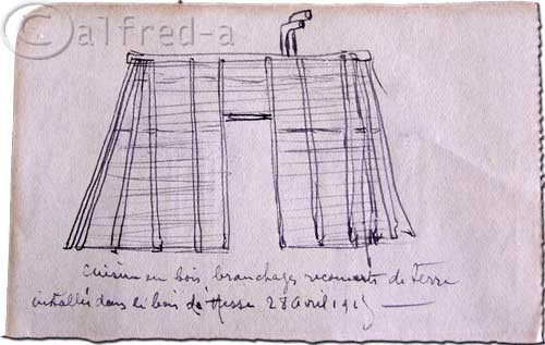 Croquis très émouvant de la "chambre" d'Alfred, il dormait sur le lit du haut, la couche inférieure étant occuppée par Léonardon 25 mai On se figure généralement que l’emploi à la cuisine est de tout repos et on ne manque pas de traiter ceux qui en ont la charge d’embusqués. Voici mon emploi du temps journalier : Lever à 4 heures du matin. Audreau est généralement levé le premier et c’est lui qui me réveille en allumant le feu de la chaudière au bouillon. Je lui aide à chauffer, je prépare la distribution : plats de viande, suppléments : sardines à l’huile (boîte à ouvrir) ou fromage. A 5 heures au plus tard la distribution commence : Audreau sert le bouillon, moi la viande et les suppléments, notant le nom de chaque homme sur la liste établie à cet effet – car s’il n’y avait pas de pointage certains sans scrupules retourneraient bien volontiers pour toucher une seconde ration. Cette distribution dure jusqu’à 6 heures. Je range alors les plats sales et porte toute la vaisselle sale au dehors de la cuisine pour que Desplats la lave dans la matinée. Je balaie l’intérieur et tout autour à l’extérieur, le devant qui nous sert de salle à manger et le tour avec le chemin. Gramaregeas ( ?) balaie devant son fourneau. Je porte dans la fosse les restes des marmites qu’Audreau nettoie, je racle la table sur laquelle nous mangeons et sur laquelle Desplats broie le café. Avec Léonardon je vais alors toucher la viande, nous l’apportons. Je la désosse et aide Audreau à faire et à compter les parts pour chacun. Tout cela nous amène à 9 heures, au plus tôt. Je vais alors me laver et à 10 heures les hommes viennent toucher leur déjeuner. Audreau et moi faisons chauffer la soupe que nous distribuons avec la viande à ceux qui nous pas touchés le matin ou qui sont restés au cantonnement après pointage. Déjeuner, épluchage des pommes de terre lorsqu’il y a rata, c'est-à-dire cinq jours sur sept en ce moment, et nous commençons vers midi à préparer le repas du soir qui est distribué à 4 heures et demi. Il faut alors surveiller deux feux et deux cuisines, qui cuisent le bouillon, le rata ou les légumes : riz ou macaroni. A l’heure du dîner je laisse la cuisine et vais surveiller et pointer la distribution du vin et du pain. Entre temps, à 3 heures j’ai reçu et distribué les lettres et les paquets que je distribue à chacun à son retour du travail. La distribution du repas du soir dure jusque vers 5heures et demi – 6 heures. A ce moment enfin, je dîne et suis libre. Nous sommes envahis par les chenilles. Ces sales bêtes pullulent littéralement. Différentes sortes, mais celles que j’ai trouvé la plus bizarres est une chenille généralement jaune, vert clair, rayé de lignes sur toute la longueur de son corps. Elle ne rampe pas, mais pour se déplacer elle rapproche d’un mouvement sec les quatre doigts qu’elle possède à l’arrière des quatre doigts de l’avant, et s’arque-boutant sur elle-même précipite alors tout son corps en avant dans une saccade brusque. Elle a la faculté de dévider un fil qui la supporte et descend ainsi suspendue par ce fil qu’elle extrait de sa bouche, de branche en branche jusqu’à terre. Et ce fut aujourd’hui une journée heureuse puisque isolé de tout – sauf des chenilles et des oiseaux – nous vîmes deux animaux domestiques nous rappelant nos foyers : un chien et un chat tout petit échappé des environs qui vint nous rendre visite à la cuisine où la nourriture l’attirait.