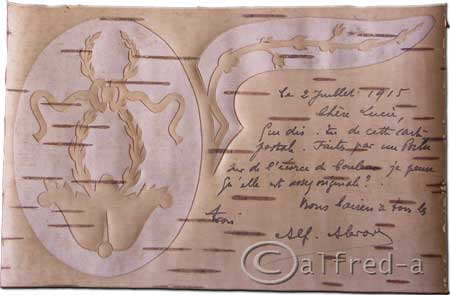 Carte gravée dans de l'écorce de bouleau, adresséée à son épouse Lucie le 02 juillet 1915 14 mai Nuit épouvantable. Je n’ai pas dormi une heure. Il a plu ; le vent soufflait avec violence dans les arbres faisant un bruit qui s’ajoutait au roulement ininterrompu des canons. C’était terrible. Par bonheur, les arbres sont très feuillus et l’eau n’a guère pénétré dans la cuisine. Ce matin nous bouchons les fentes mais c’est là un gros travail. La bataille continue acharnée, sans arrêt. Nous n’avons pas de journaux. Il paraît que nous avançons vers Arras et que l’attaque sur tout le front est engagée, jours d’espoirs, vous réaliserez-vous ?